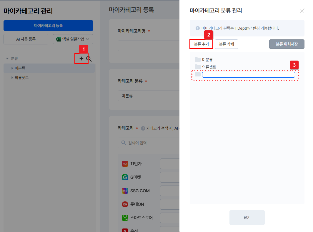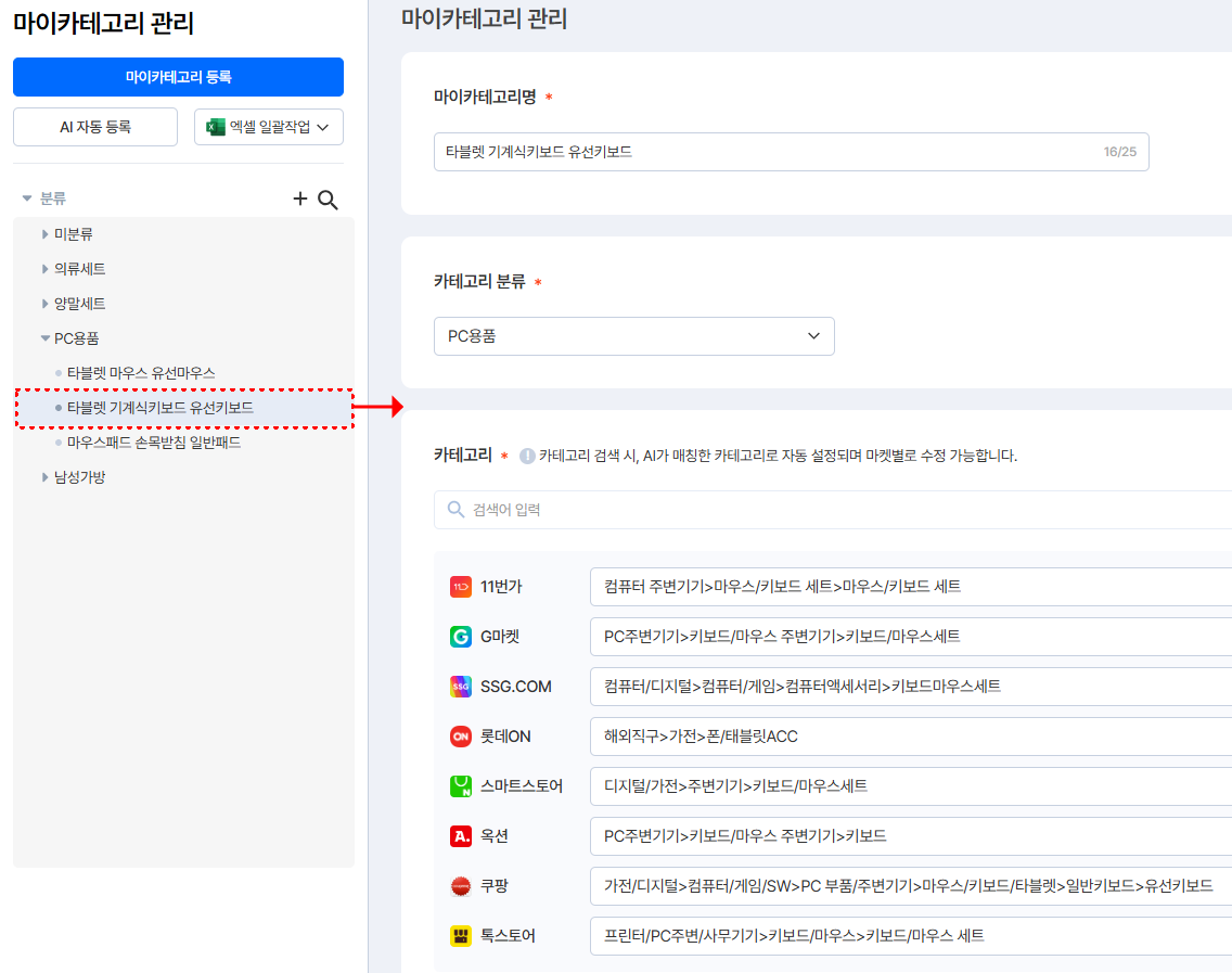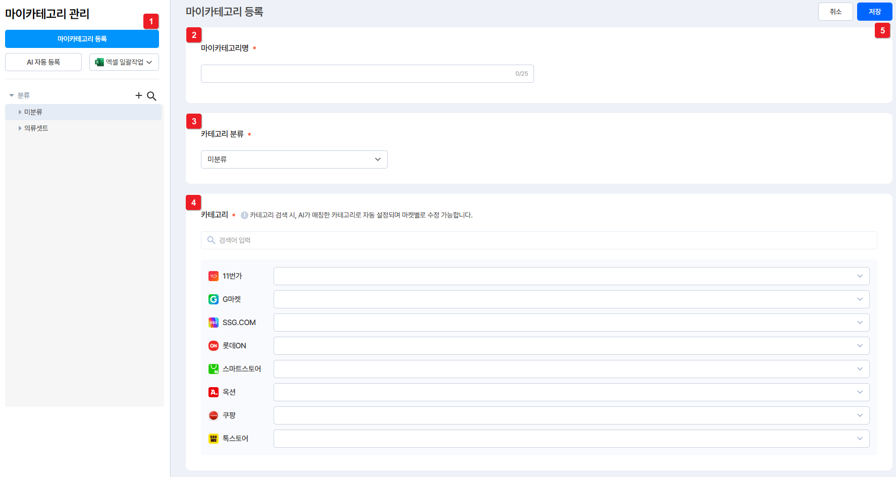 ④ 해당 마이카테고리가 실제 마켓에 등록되는 마켓별 카테고리를 설정할 수 있어요.