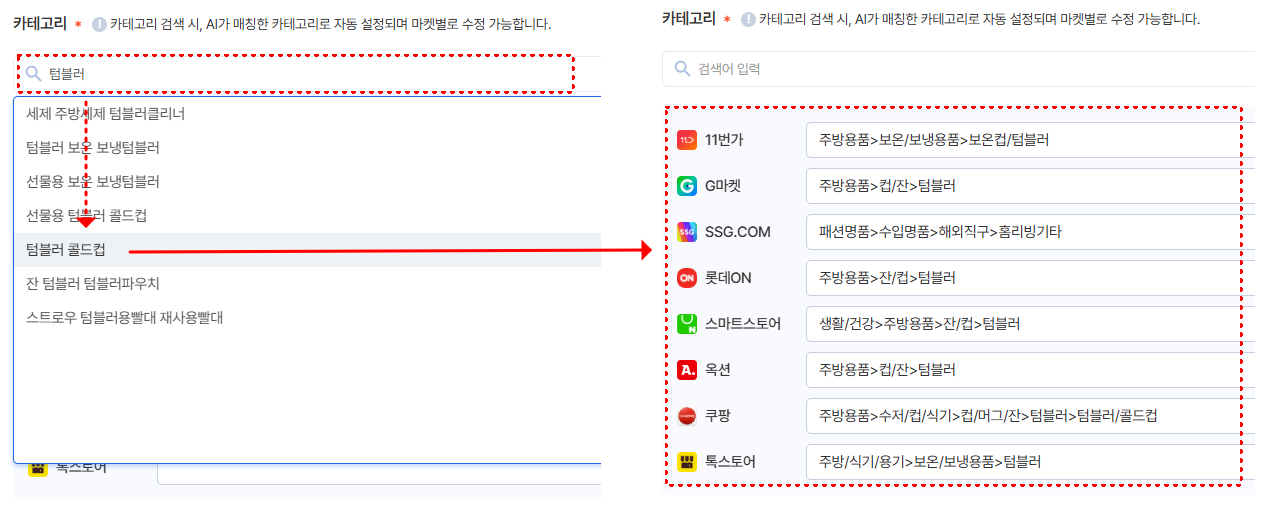 카테고리 검색 시, AI가 매칭한 카테고리로 자동설정 돼요.