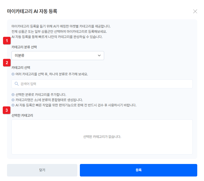 AI 자동 매칭기능을 통해 여러개의 카테고리를 한 번에 등록할 수 있어요.