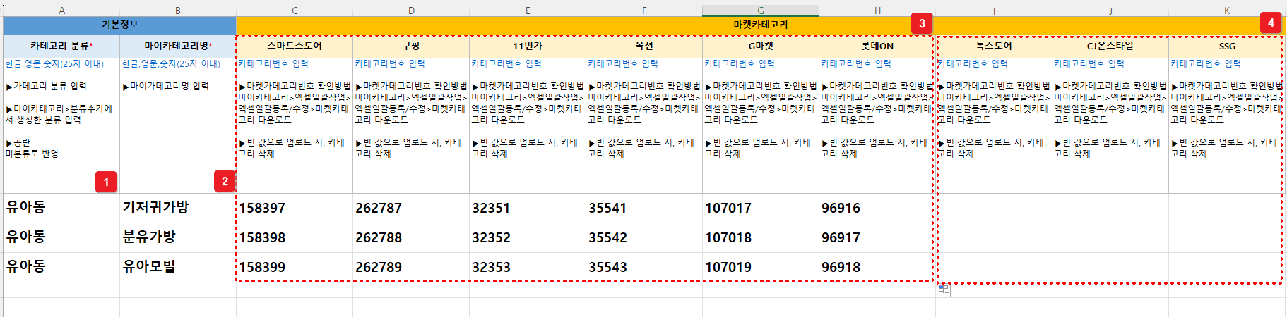 ③ 마켓카테고리(사용하는 마켓) : 각 마켓별 카테고리 번호를 입력해야 해요. 마켓별 카테고리번호는 아래 경로에서 다운로드한 뒤 확인할 수 있어요.
