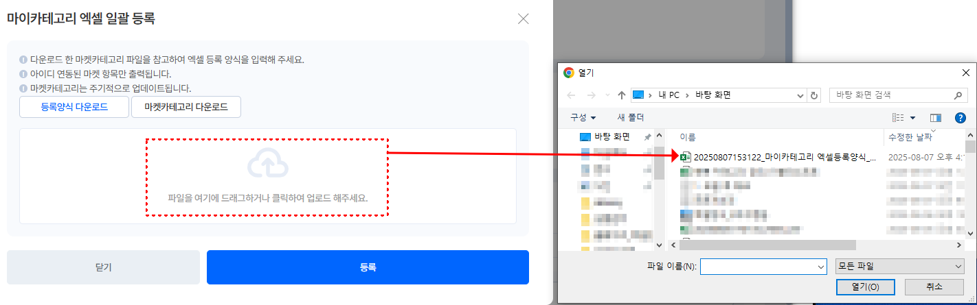 [마이카테고리 관리] → [엑셀 일괄작업] → [엑셀 일괄등록] 을 선택해요.