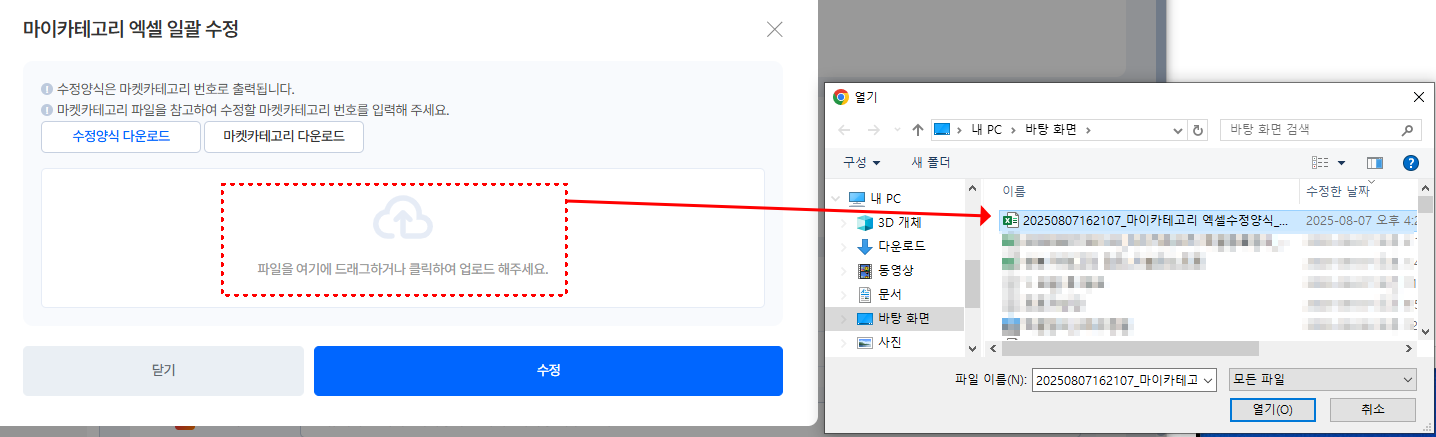 [마이카테고리 관리] → [엑셀 일괄작업] → [엑셀 일괄수정]을 선택해요.