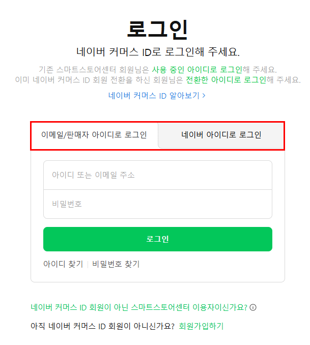 판매자 유형 선택(판매자아이디 or 네이버아이디) : 로그인 시 사용하는 유형을 선택해요.