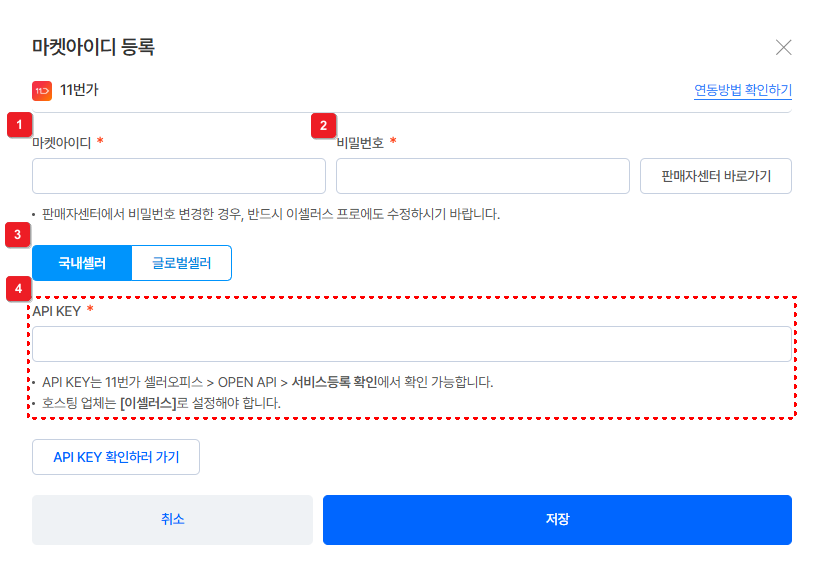 11번가 API 대행사를 [이셀러스] 설정해야 해요.
