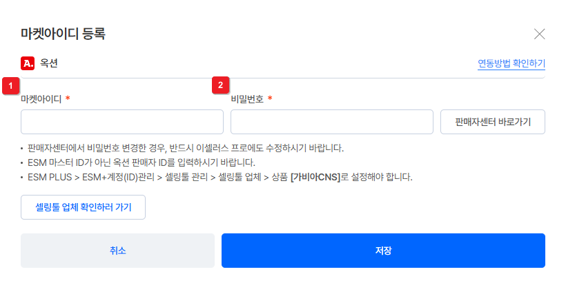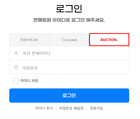 ※ ESM PLUS 정보가 아닌 [옥션] ID와 비밀번호 정보를 입력해야 해요. 사이트 접속 시 AUCTION 선택 후 로그인하여 정보 확인 후 입력해주세요.