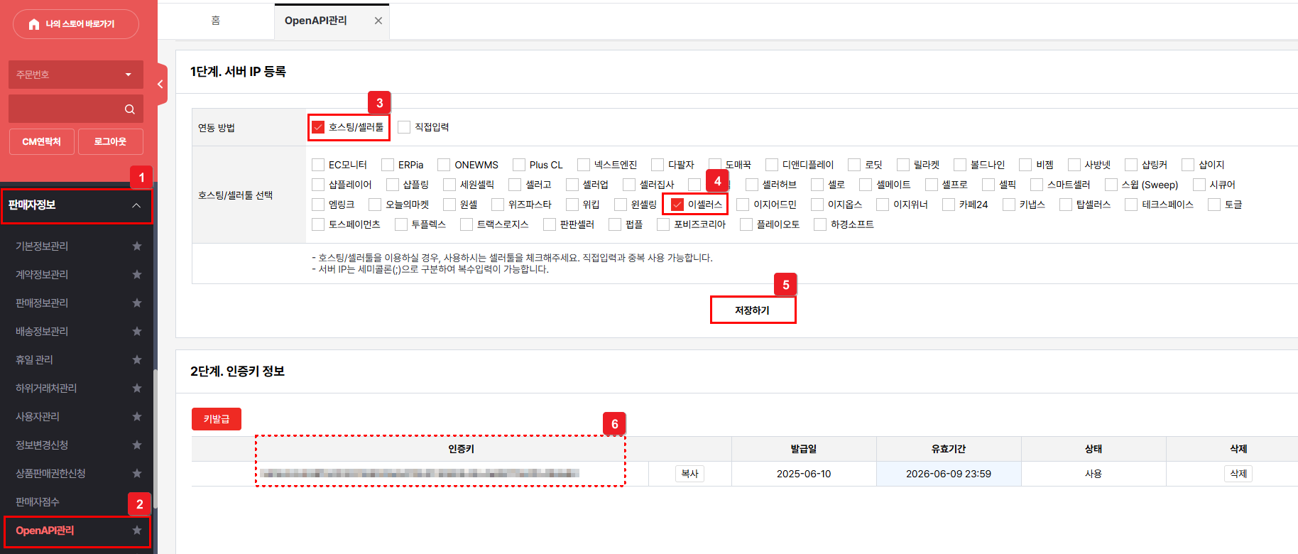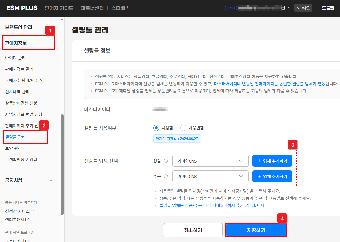 ④ [호스팅/셀러툴] 선택 - [이셀러스] 체크 - [저장하기] 선택해요.