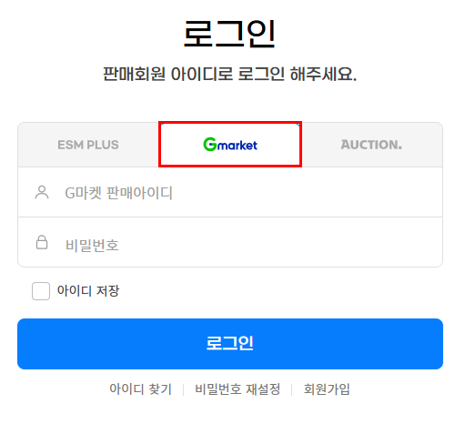 ※ ESM PLUS 정보가 아닌 [G마켓] ID와 비밀번호 정보를 입력해야 해요. 사이트 접속 시