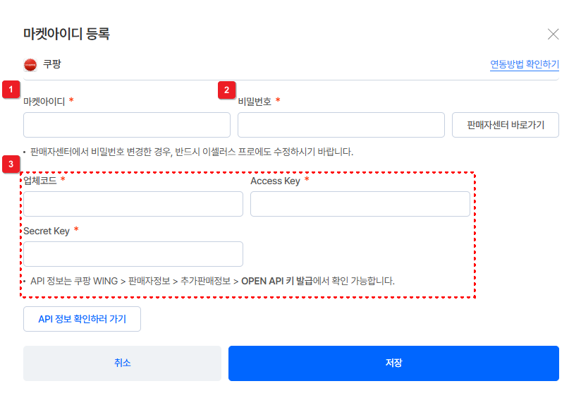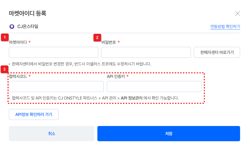⑥ [API 인증키] 및 [협력사 코드]를 마켓아이디 추가 시에 입력해요.