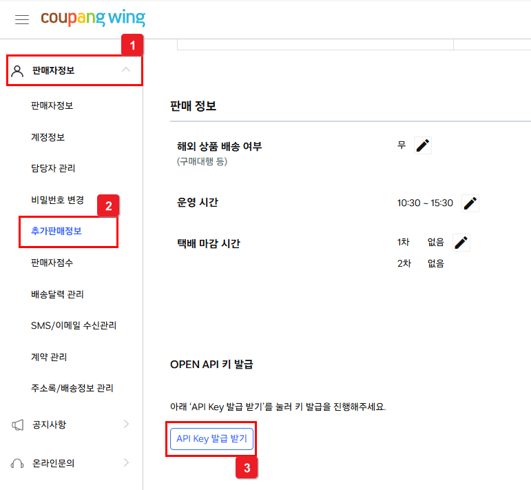 ② [판매자정보] - [추가판매정보] - [API KEY 발급 받기] 선택해요.