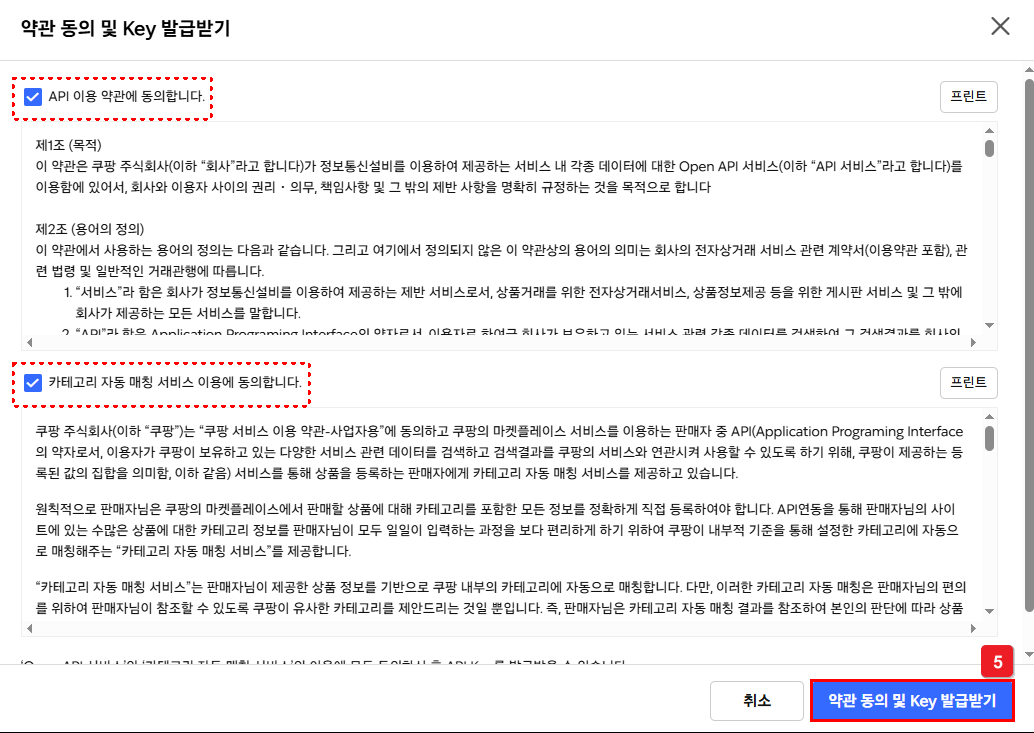 ④ 약관 동의 항목 확인 및 체크 후 [약관 동의 및 Key 발급받기] 선택해요.