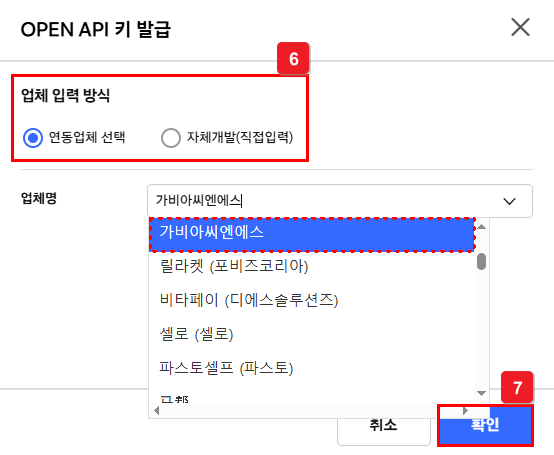 ⑤ [연동업체 선택] - [가비아씨엔에스] - 선택한 뒤 [확인] 선택해요.