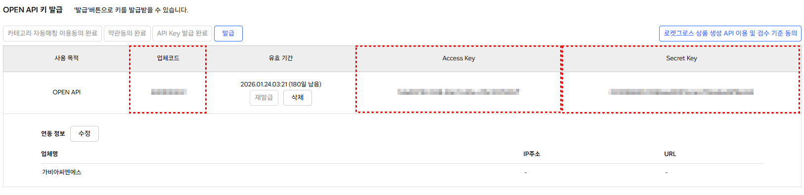 ⑥ 발급된 API 키 확인 후 [업체코드] / [Access Key] / [Secret Key]를 마켓아이디 추가 시에 입력 해요.