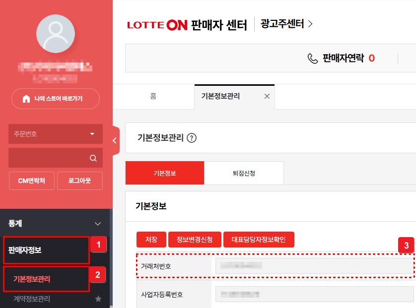 ② [판매자정보] - [기본정보관리] 내 [거래처 번호] 확인해요.