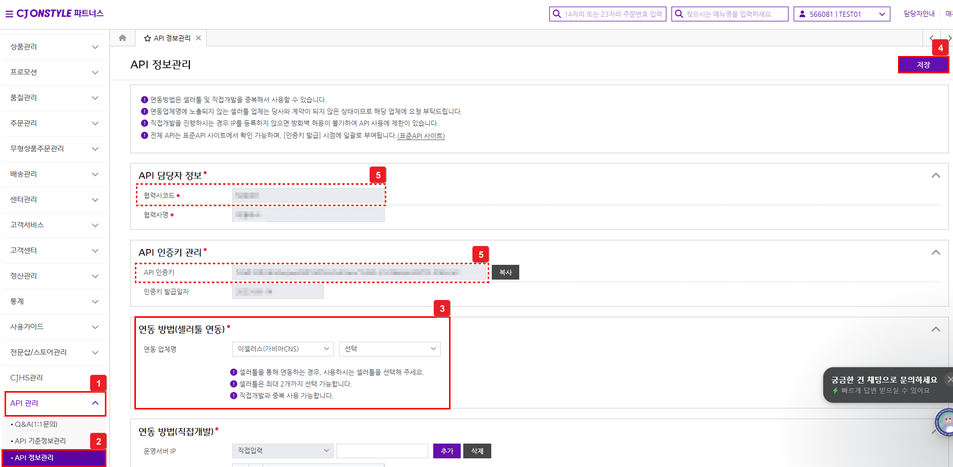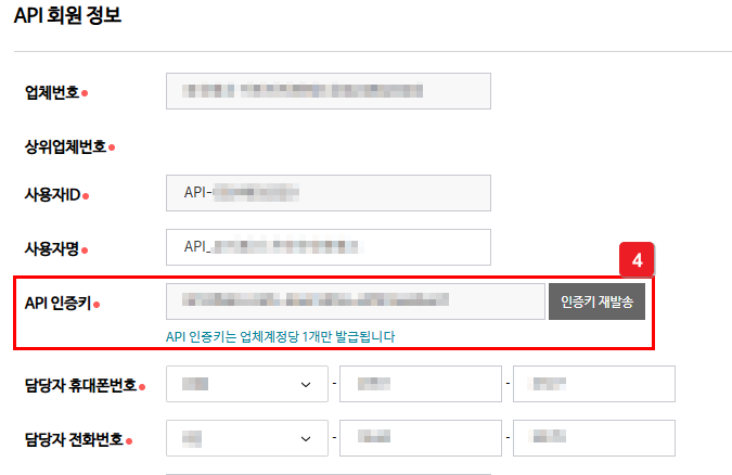 ④ 저장 후 [API 인증키] 및 [협력사 코드] 확인해요.