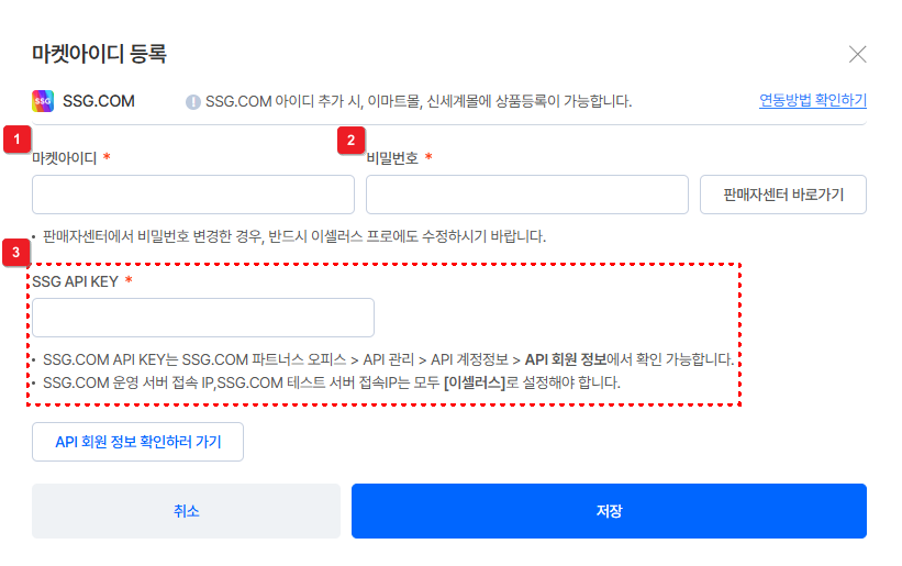 [SSG.COM 운영 서버 접속 IP] 및 [SSG.COM 테스트 서버 접속IP]를 [이셀러스 주머니]로 설정해야 해요.