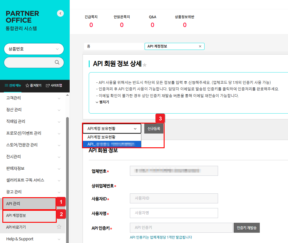 ③ [API 관리] 선택 후 화면에 정보 입력 및 서비스 이용 동의 체크 후 Key 발급합니다. - 셀링툴 업체 선택 : 이셀러스