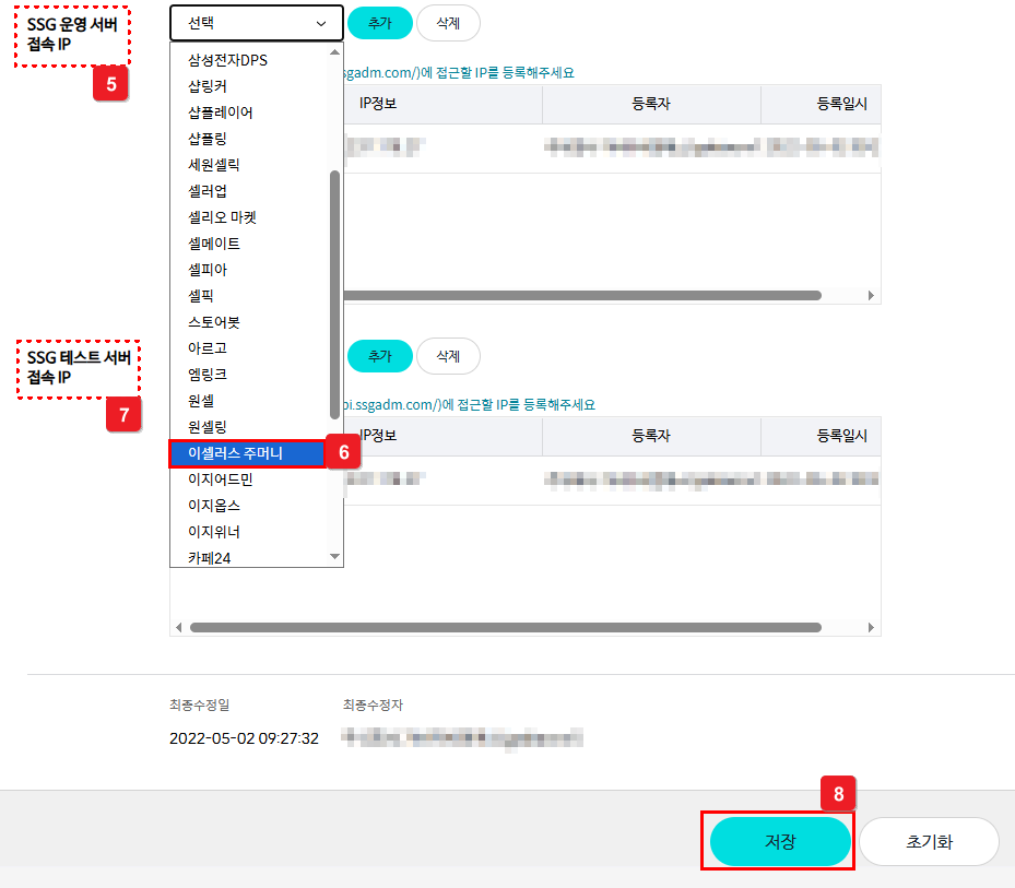 ⑤ [SSG 운영 서버 접속 IP] 탭 내 대행사 [이셀러스 주머니] 선택 후 추가해요.
