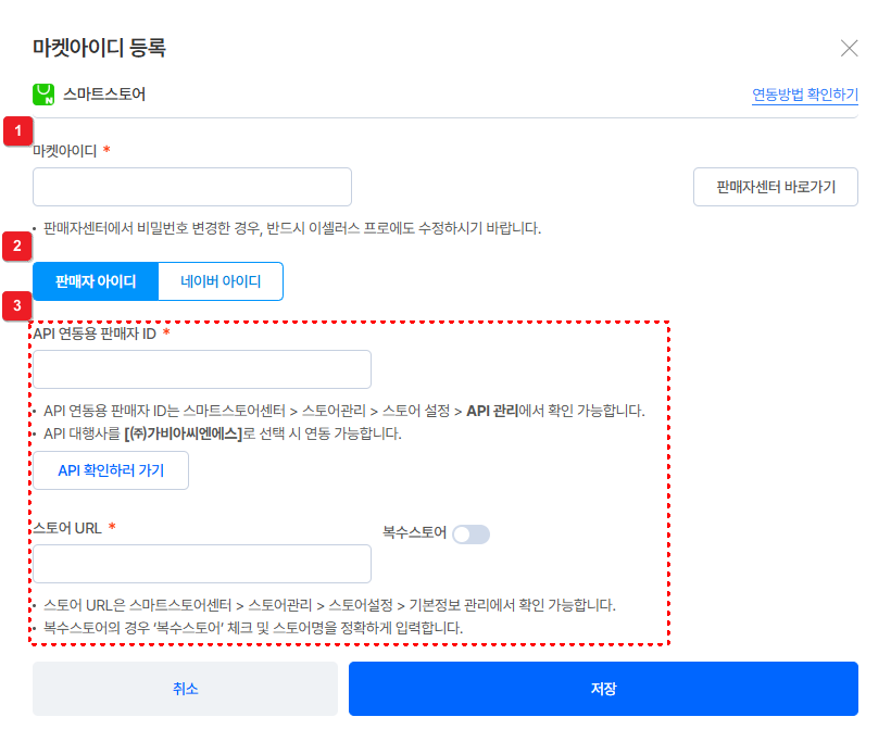 ⑥ [API 연동용 판매자ID]와 [스토어 URL]을 마켓아이디 추가 시에 입력해요.