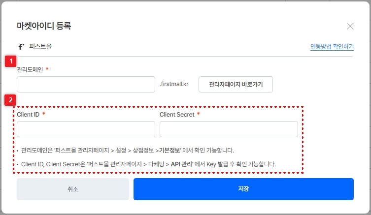 마켓아이디 : 퍼스트몰 관리도메인을 입력해요.
