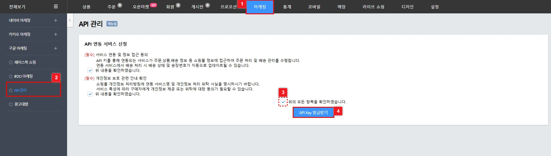 ② [마케팅] - [API 관리] 선택한 뒤 '약관 동의' 한 뒤 [API Key 발급받기]를 클릭해요.