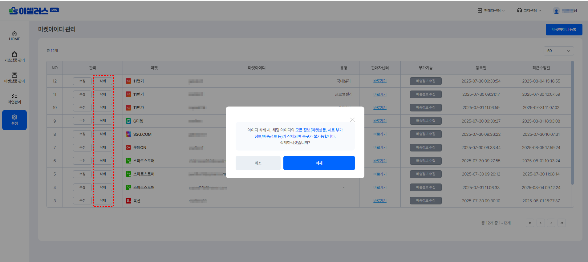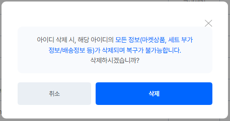 '아이디 삭제 시, 해당 아이디의 모든정보(마켓상품, 세트 부가정보/배송정보 등)가 삭제되며 복구가 불가능합니다. 삭제하시겠습니까?' 팝업 노출돼요.