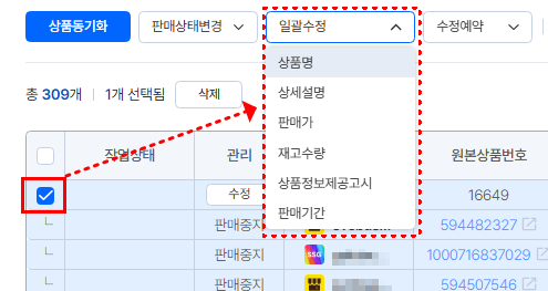 수정 원하는 원본상품을 다수 체크 후 일괄수정 버튼을 눌러 항목을 선택해요.