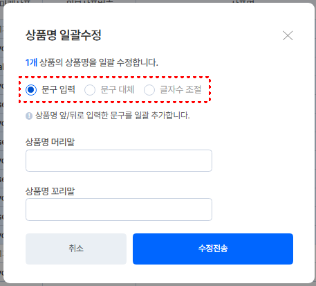 문구입력 : 단순 문구를 추가해요. 상품명 앞/뒤로 입력한 문구를 일괄 추가할 수 있어요.