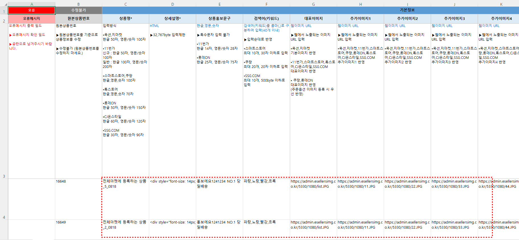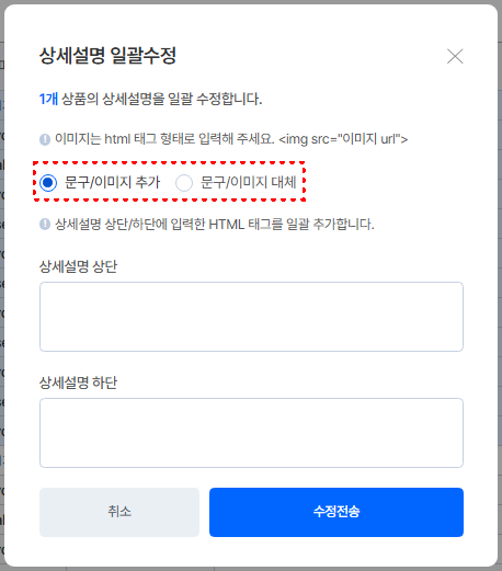 문구/이미지 추가 : 상세설명 상단/하단에 입력한 내용을 일괄 추가해요. 단순 텍스트 및 HTML 태그 모두 입력 가능해요.