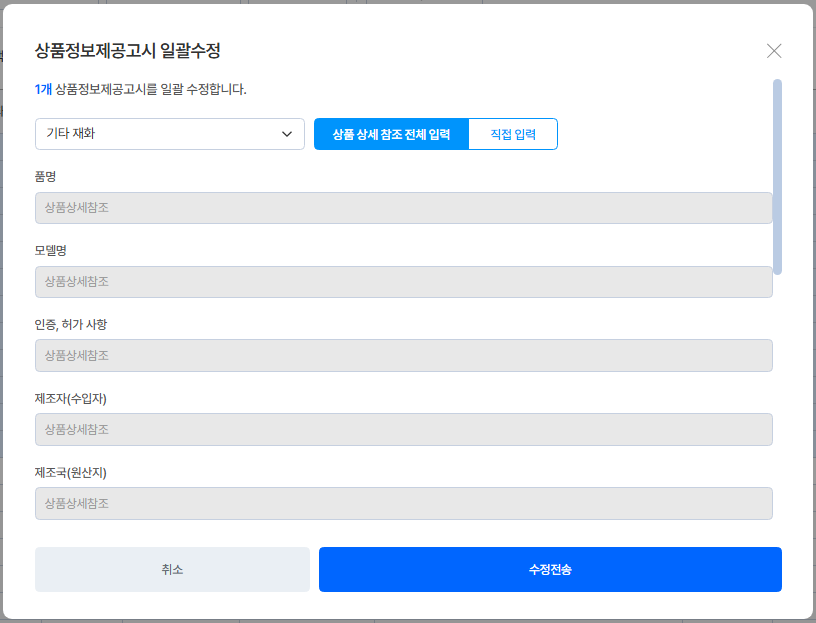 [상품 상세 참조 전체 입력] 선택 시, 세부 항목이 모두 상품상세참조로 입력돼요.