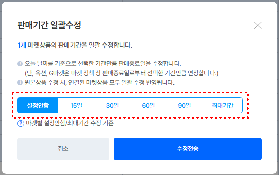 상품의 판매기간을 일괄적으로 수정할 수 있어요.