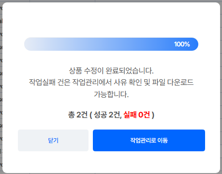 [엑셀일괄작업] → [수정파일 업로드] 선택하여 엑셀파일을 업로드 해요.