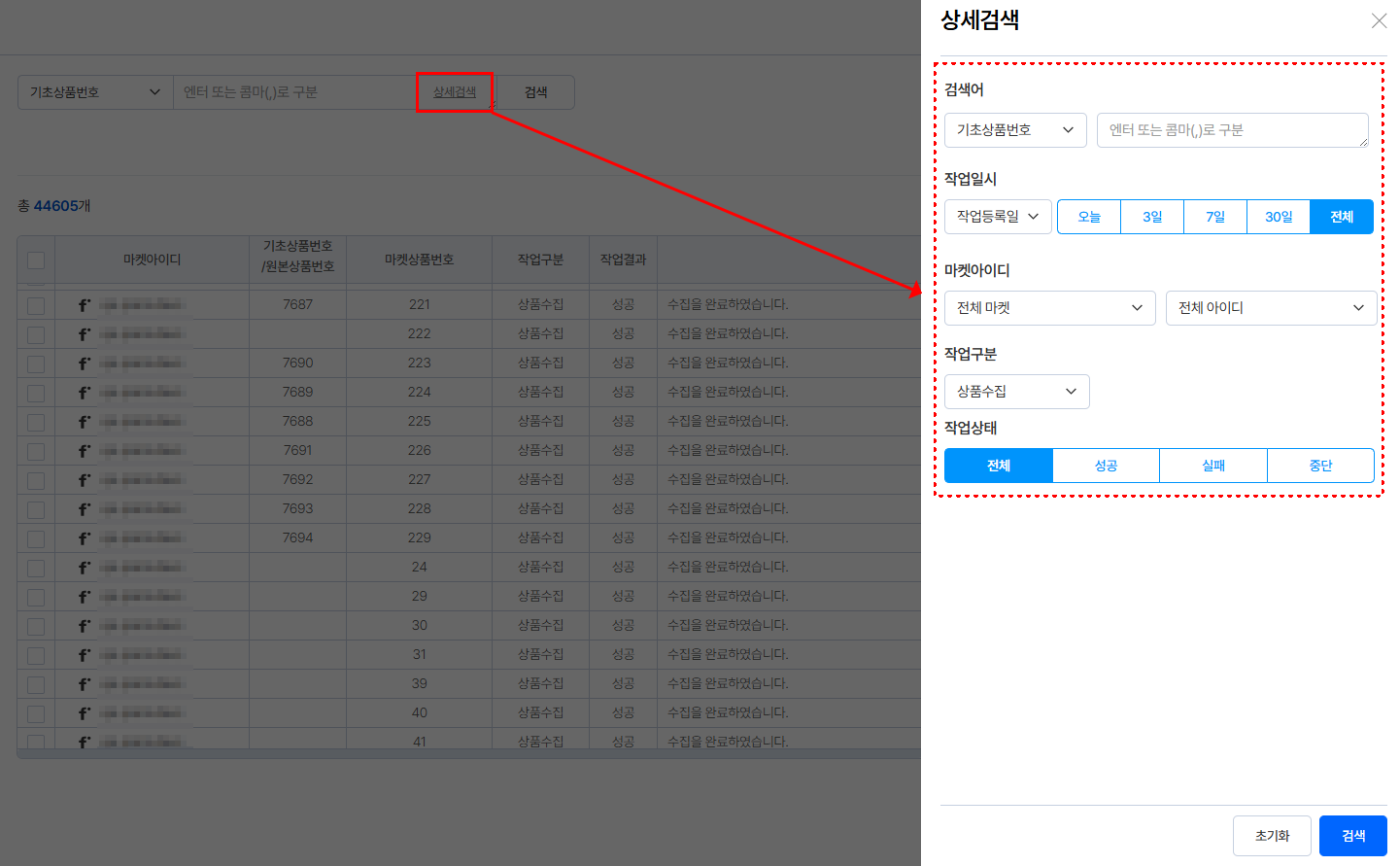 상품등록, 상품수집 작업 진행 시, [상세] 버튼을 누르면 세부 설정값을 확인할 수 있어요!