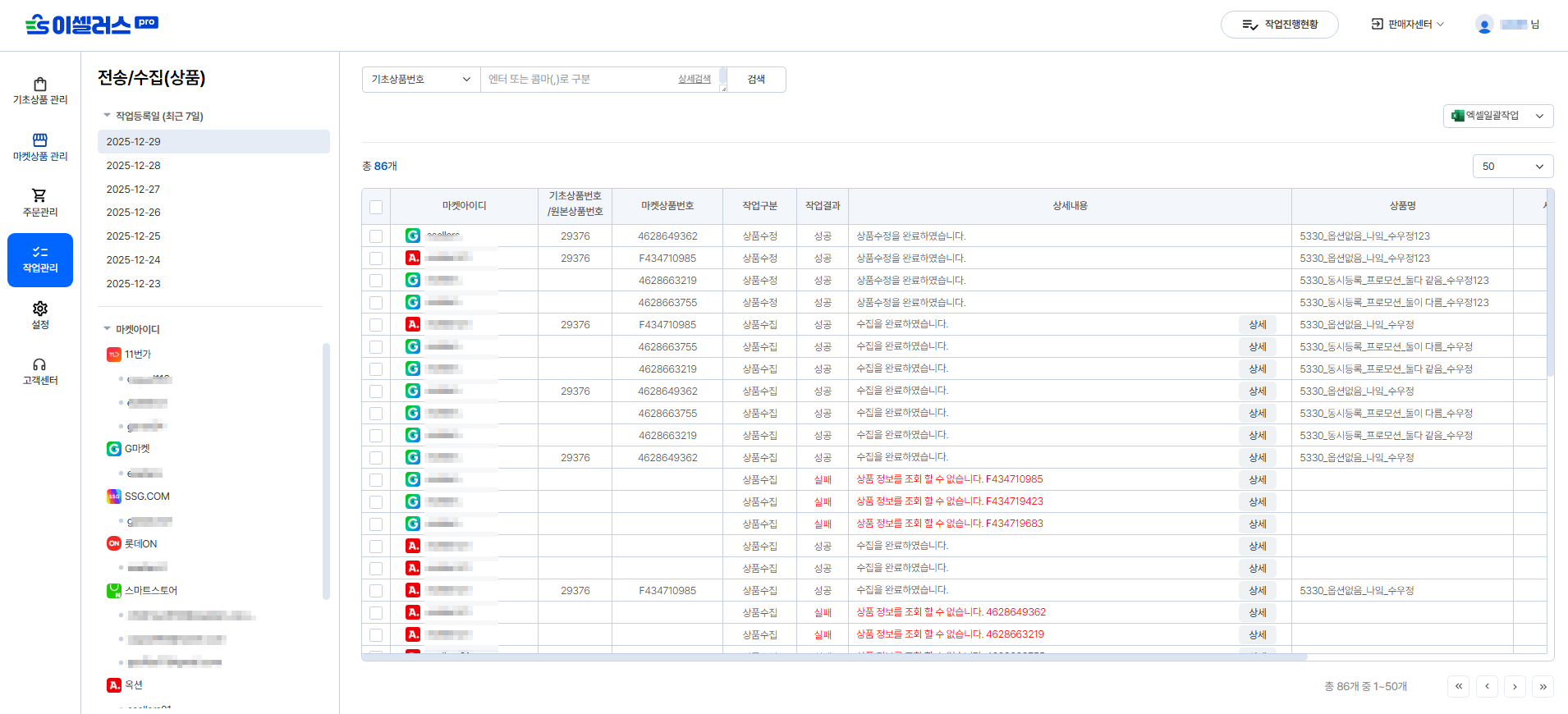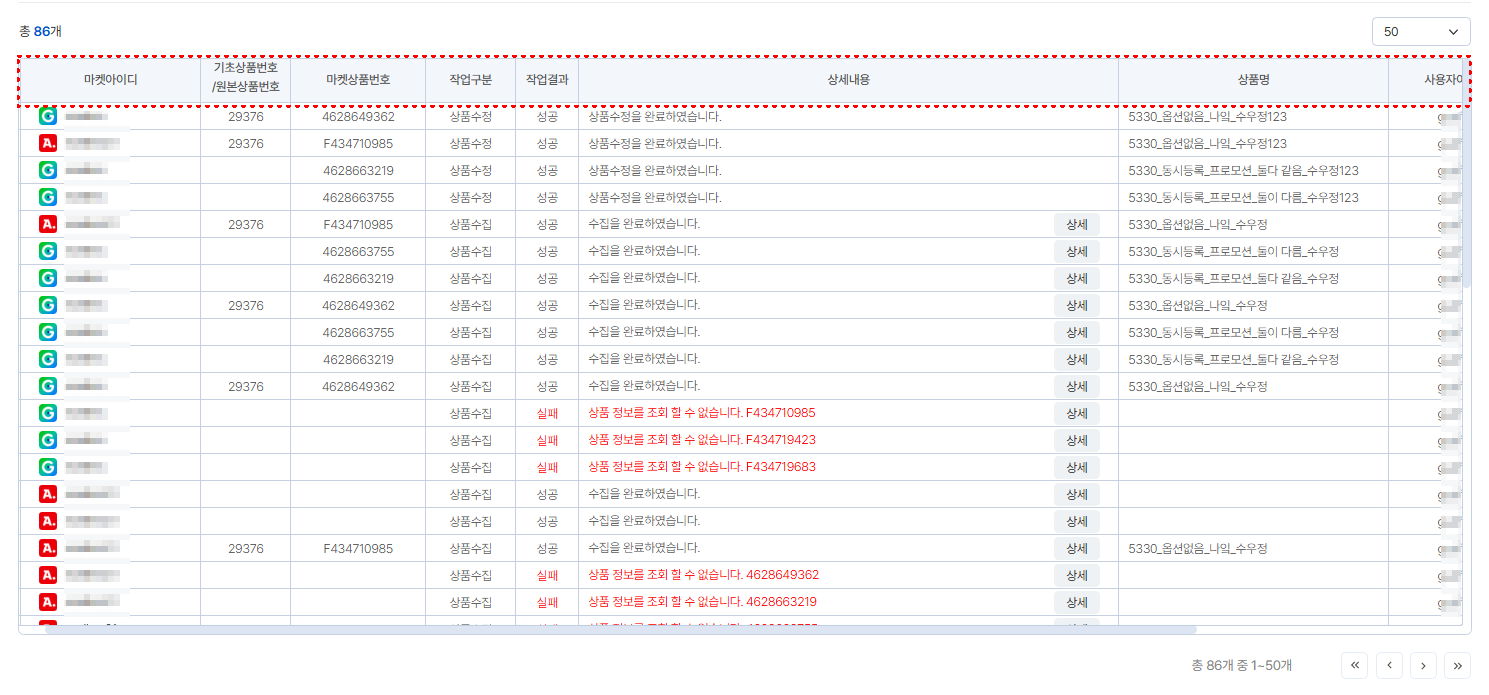 필터링 기능을 이용하여 날짜별 작업 / 마켓별 / 마켓아이디별 작업을 손쉽게 확인할 수 있어요!