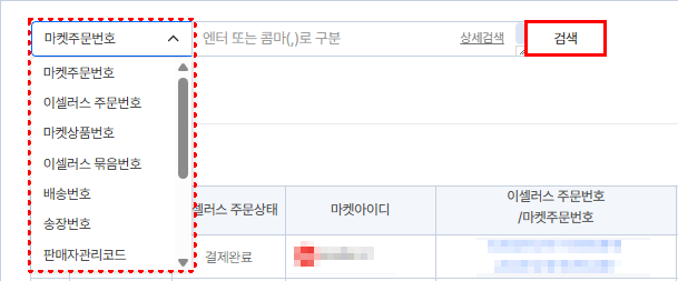 검색 항목 : 마켓주문번호, 이셀러스 주문번호, 마켓상품번호, 이셀러스 묶음번호, 배송번호, 송장번호, 판매자관리코드, 상품명, 구매자 이름, 구매자 연락처, 수령자 이름, 수령자 연락처
