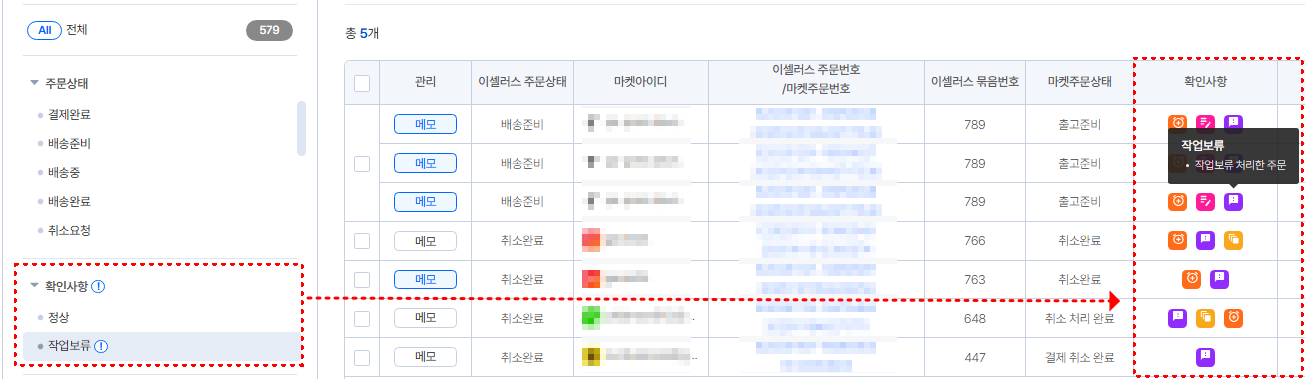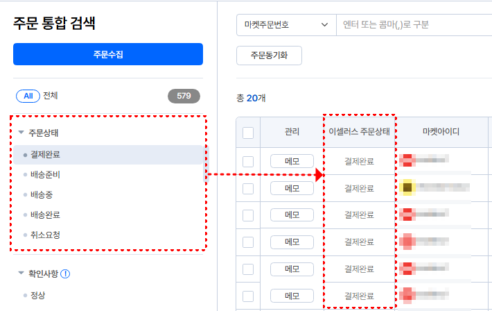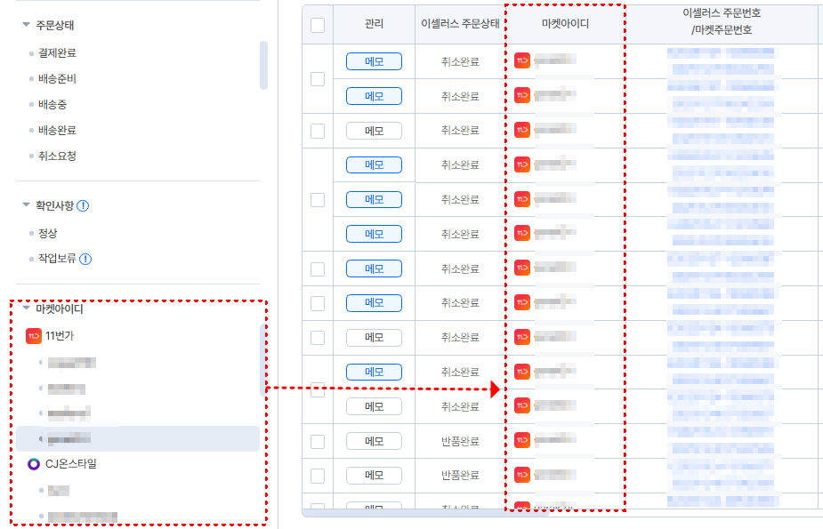 • 화면 좌측에 뒤치한 주문 상태, 확인사항, 마켓아이디 기준으로 필터 설정해서 원하는 주문들만 볼 수 있어요.