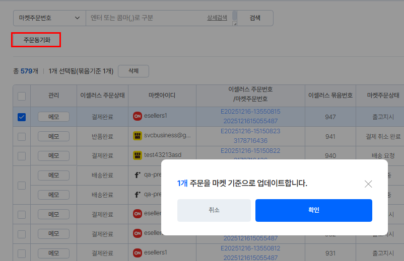 • '*개 주문을 마켓 기준으로 업데이트합니다.' 팝업되면 확인을 눌러서 업데이트를 할 수 있어요.