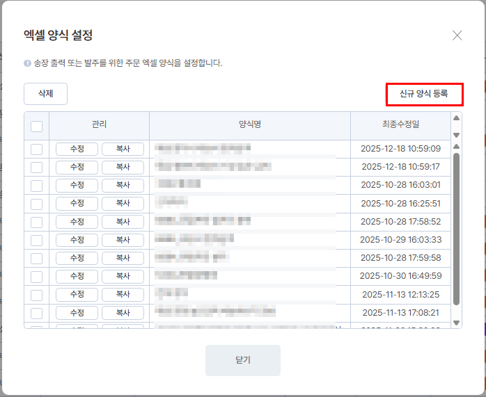 • [엑셀 일괄잘업] → [엑셀 양식 설정] → [신규 양식 등록] 메뉴에서 양식을 추가할 수 있어요.