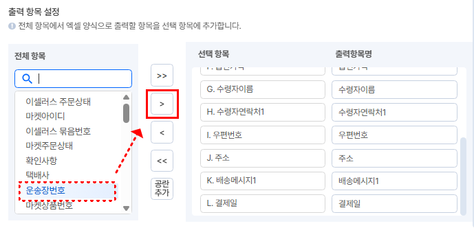 1. 전체항목에서 원하는 항목을 선택한 뒤 [>]를 클릭해서 선택항목으로 이동시켜야 해요.