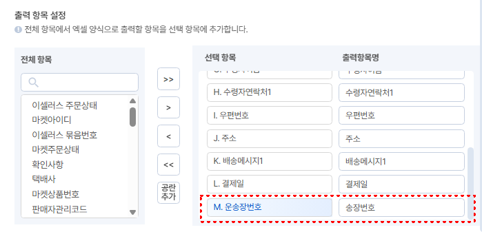 1. 추가된 선택항목을 확인한 뒤 '출력항목명'에서 엑셀에 실제 출력될 항목명을 입력할 수 있어요.