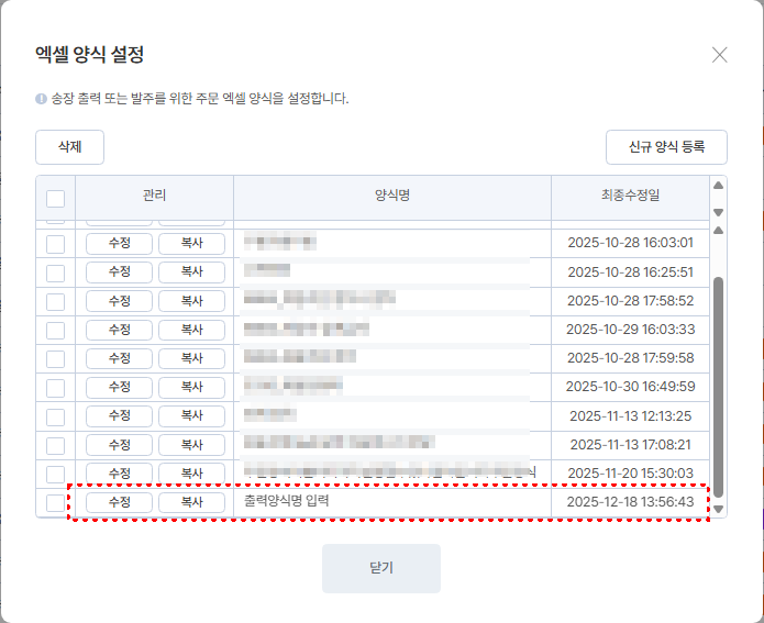 1. 출력 항목을 모두 설정한 뒤 저장을 클릭하면 엑셀 양식 설정 항목 리스트에서 저장된 양식을 확인할 수 있어요.