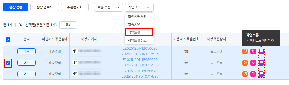 • 주문을 선택한 뒤 [작업처리] → [작업보류] 설정할 수 있어요.