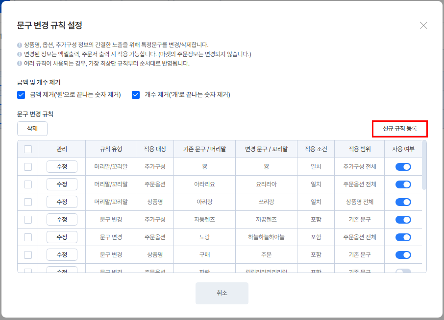 • [추가기능] → [문구변경규칙 설정] 메뉴에서 [신규 규칙 등록] 버튼을 클릭해서 추가할 수 있어요.