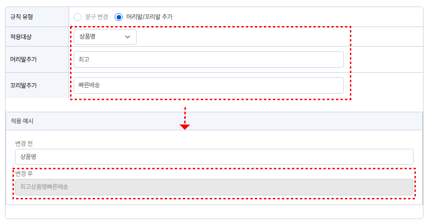 예시) 상품명에 머리말 '최고' , 꼬리말 '빠른배송'을 일괄 입력되어 출력되길 원할 경우