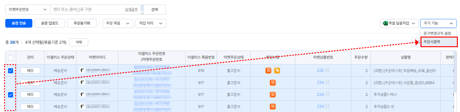 • 출력할 주문 선택한 뒤 [추가 기능] → [주문서 출력] 메뉴에서 출력할 수 있어요.