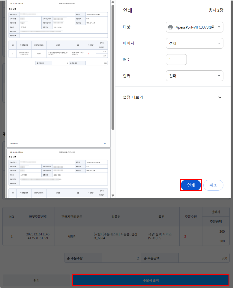 • [주문서 출력]을 클릭해서 인쇄할 수 있어요.