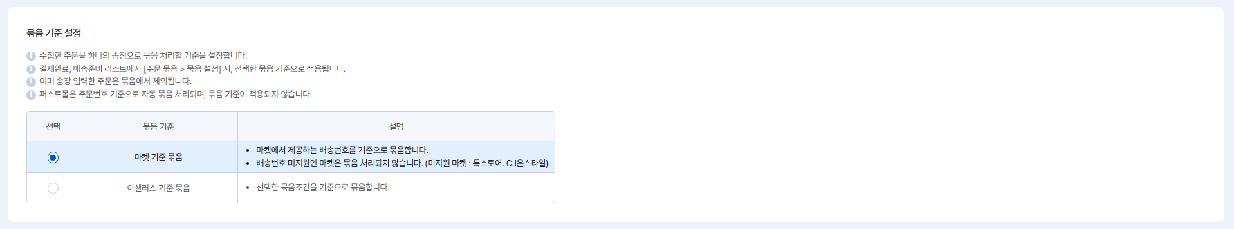 마켓에서 제공하는 배송번호를 기준으로 묶음처리를 할 수 있어요