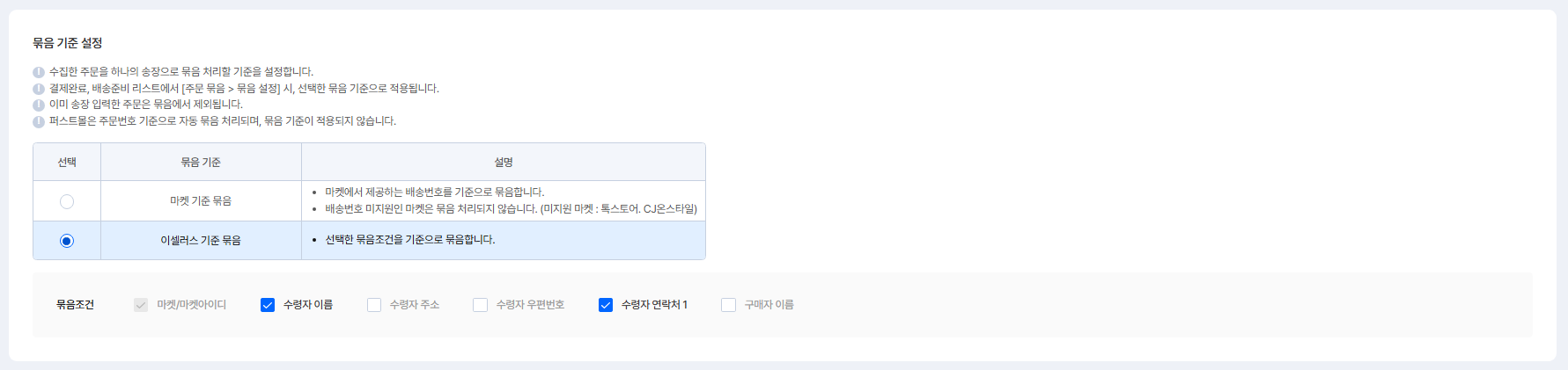 묶음 조건 : 마켓/마켓아이디, 수령자 이름, 수령자 주소, 수령자 우편번호, 수령자 연락처1, 구매자 이름
