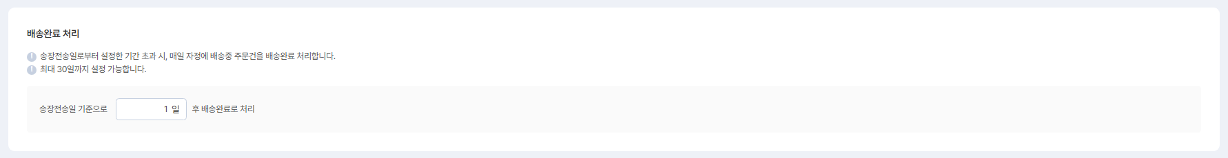 송장전송일기준으로 설정한 기간 초과 시, 매일 자정에 배송중 주문건을 배송완료 처리해요.