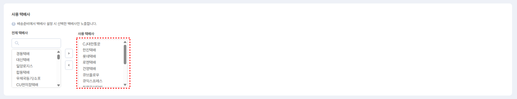 배송준비에서 택배사 설정 시 선택한 택배사만 노출되도록 할 수 있어요.