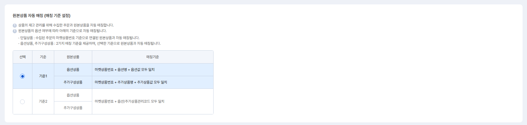 옵션상품, 추가구성상품 : 2가지 매칭 기준을 제공하며, 선택한 기준으로 원본상품과 자동 매칭돼요.